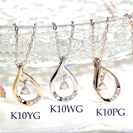 ☆K10で描かれたエアリーなペアシェイプモチーフに、上質なダイヤモンドをセットした大人可愛いネックレス。