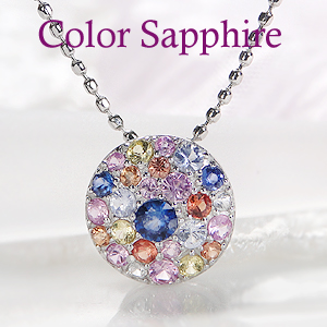 ☆K18ホワイトゴールドのラウンドモチーフに、マルチカラーのサファイアをセッティングしたカラフルなパヴェネックレス。